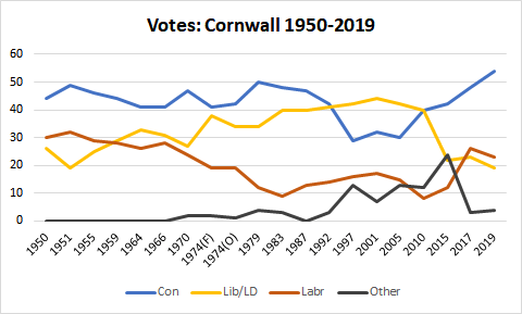 In the inter-war period the Tories and their assorted ex-Liberal allies had never won more than 44% of the Cornish vote. In the four elections in the 1950s they never won less. The Liberal decline reached bottom in 1951, although the party recovered to retake second place from Labour in 1959. Labour’s vote meanwhile, at 28-30%, was at its historic peak in this period.