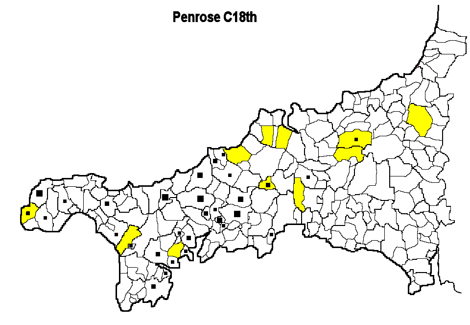 Let’s travel further back, to the 18th century and look at the names of women in the marriage registers – women because marriages usually took place in their parish of residence. The marriage register data suggest that the distribution of Penroses at this point resembled that of 1861, but with a more scattered distribution. For instance there were Penroses on the Lizard, although these seem to have migrated northwards to the burgeoning industrial areas between the mid 18th and 19th centuries.