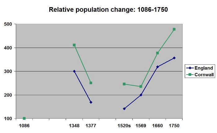 On the other hand, Cornwall is supposed to have been economically more bouyant than average in the 15th century and comparisons of the taxable wealth in 1334 and 1515 shows that Cornwall was one of those places enjoying the most impressive relative rise. It would seem unlikely that relative rising prosperity in this period would be associated with relatively falling population. My own estimate for the population of Cornwall in the 1520s suggest a population of between 52,000 and 77,000. If we take a mid-point of 64,000 then the Cornish population is likely to have been over 70,000 by 1569. This means that it grew slightly less fast than that of England to 1660, to reach 98,000 by that year.