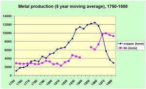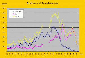 Recurrent crashes in the price of metals, and particularly tin – notably in the mid-1890s, the early 1920s and the 1980s – punctuated a long drawn out decline of mining in Cornwall. The graph below shows the value of Cornish mining before 1914 once price changes have been factored in. The peak in the 1850s and 1860s can be clearly seen. Even this understimates the value from the industry as income from lead-silver production is not included. This rose and fell in one generation, from the 1840s to the 1870s, and its height in the 1850s and early 1860s added around 10% to the value of Cornish mining.