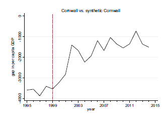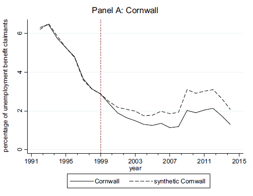 The article then moves on to the data. A sophisticated analysis of unemployment and GDP per capita is undertaken at the level of regions and wards. This is done through constructing ‘synthetic’ regions and wards. These combine non-eligible (or ‘untreated’) regions and wards closest to Cornwall and South Yorkshire in terms of factors including labour force typology, levels of education, % of fixed capital formation and the like. The performance of Cornwall and South Yorkshire is then compared with these synthetic regions.